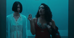 Munculnya kedatangan Asmara juga menjadi titik balik perlawanan di film ini. Renata bertemu Asmara untuk pertama kalinya di lorong apartemen dan mereka masuk ke dalam lift secara bersamaan. Terlihat penampilan mereka yang sangat kontras dalam balutan medium shot [Gambar 1]. Renata dengan pakaian tertutup dan wajah tanpa riasan, sementara Asmara mengenakan pakaian terbuka dan wajah yang penuh make-up. Renata juga pada akhirnya berani untuk berteman dengan Asmara. Asmara yang tampak hidup dalam kebebasan, banyak menyadarkan akan betapa bodoh Renata yang memilih untuk bertahan dalam belenggu Edwin.