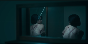 Representasi kekerasan juga banyak ditampilkan dengan cara yang simbolik, seperti bekas memar di tubuh Renata pada refleksi cermin yang retak [Gambar 5]. Penerapan sinematografi kekerasan melalui simbol ini justru lebih mengguncang kesadaran kita. Karena kita seperti dipaksa untuk melihat manusia yang tubuhnya sudah hancur, namun harus tetap melanjutkan hidup di dalam kekacauan. Penonton juga merasakan trauma, bukan hanya melihat kekerasan. Dengan ini, Sehidup Semati turut menyatakan bahwa tubuh perempuan dalam sinema bukanlah ruang eksploitasi, melainkan medium untuk menyuarakan trauma dan perlawanan